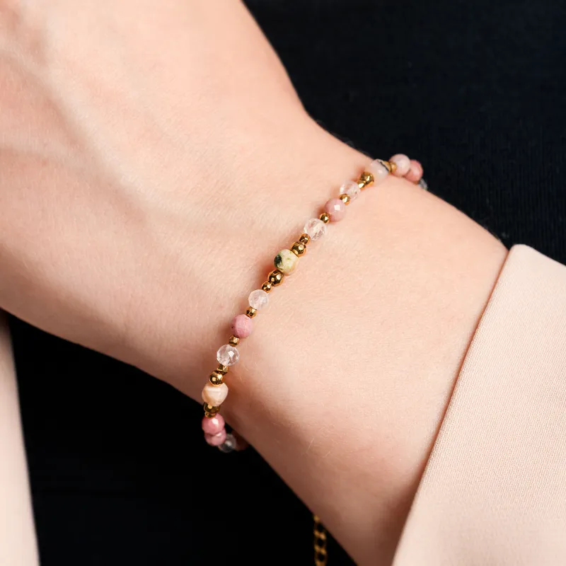 Opal, Rodochrozyt, Kryształ Górski, Hematyt - srebrna pozłacana bransoletka na kreatywność, harmonię, miłość - Pocałunek Miłości