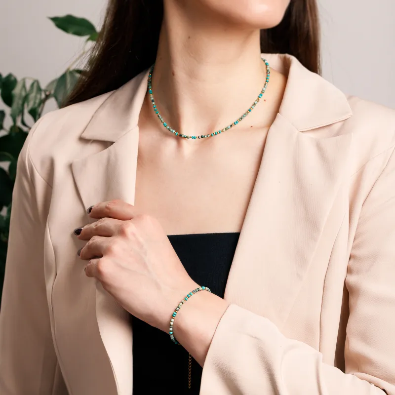 - Kamienie naturalne – turkus i hematyt – o rozmiarze 2-3 mm, fasetowane w kształcie kulek i oponek, delikatnie mienią się na nadgarstku.