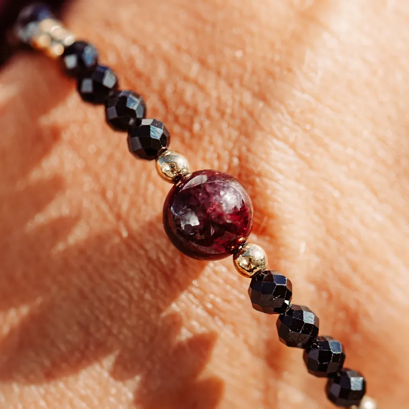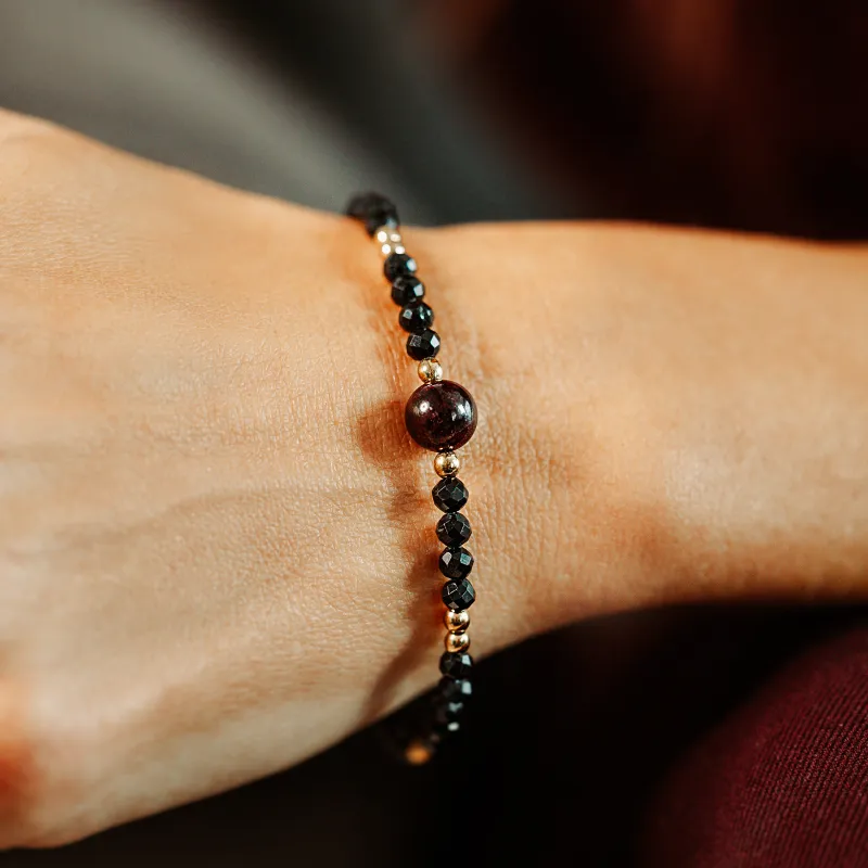 Granat, Turmalin, Hematyt - srebrna pozłacana bransoletka na zdrowie, miłość, kreatywność - Pocałunek Miłości