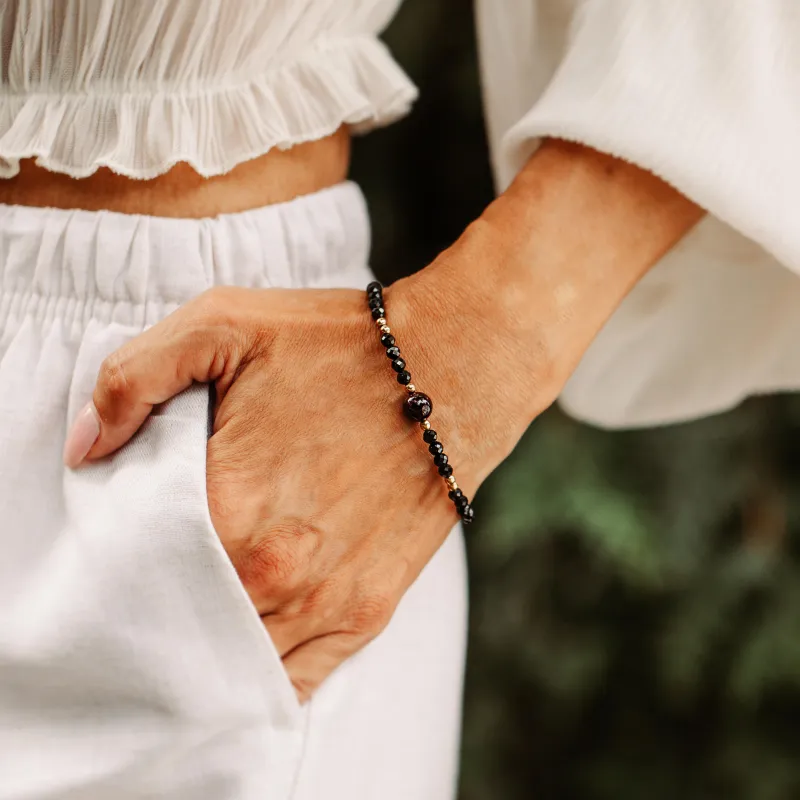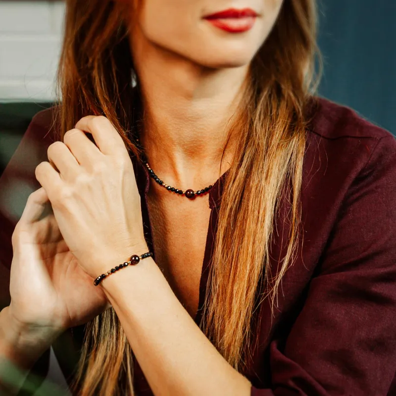 Turmalin to kamień ochronny, który w tej kompozycji pełni rolę strażnika emocji. Jego głęboka czerń absorbuje negatywne energie, oczyszcza aurę i pozwala utrzymać emocjonalną równowagę. Pomaga zachować klarowność myśli oraz chroni serce przed energetycznym przeciążeniem. Symbolizuje stabilność, samoakceptację i wewnętrzną siłę.