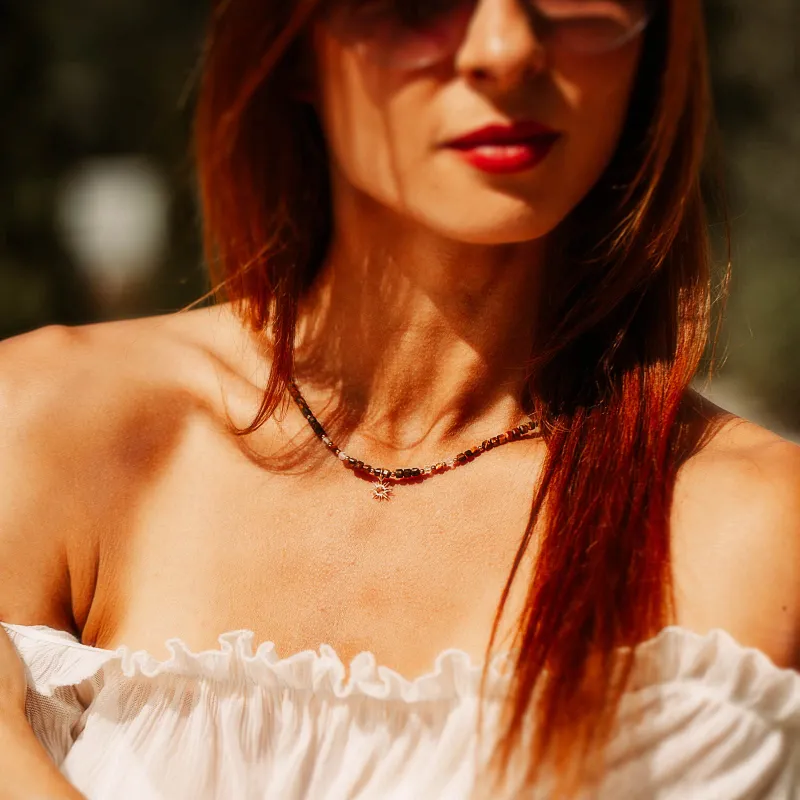 Damski naszyjnik idealny na każdą porę roku, w kolorystyce złotej, brązowej i żółtej, stanowi doskonały prezent dla siebie lub bliskiej osoby, której życzysz sukcesu i dostatku.