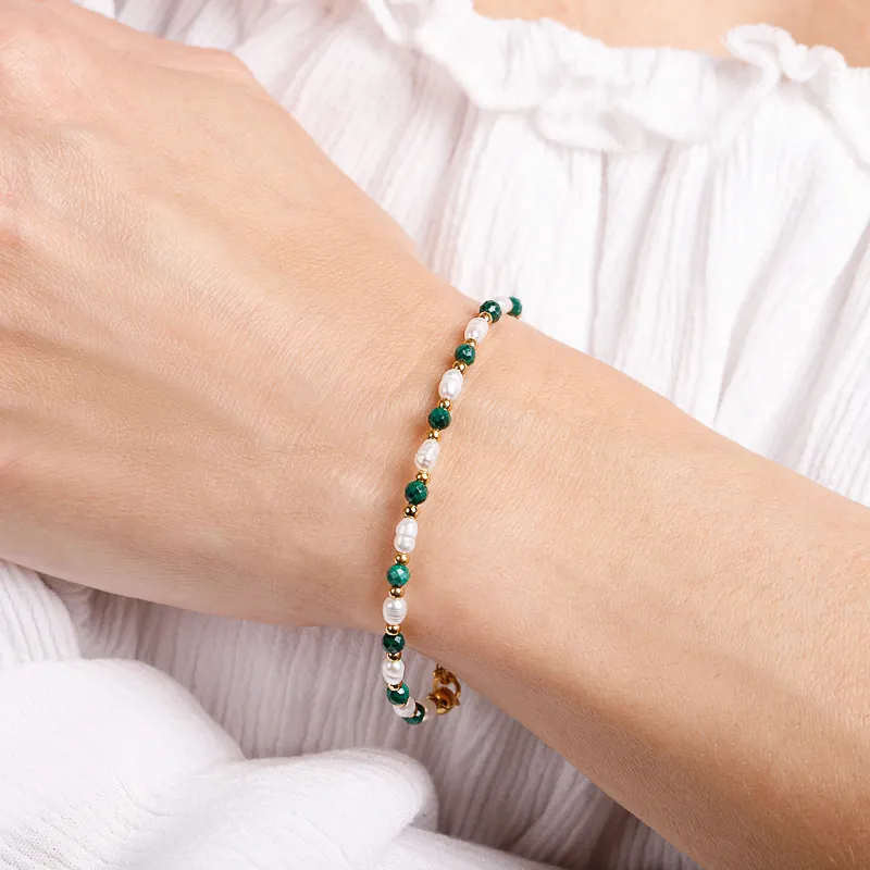 Pozwól sobie zanurzyć się w głębinach oceanu i odkryć magiczną moc tej wyjątkowej bransoletki, która nie tylko pięknie zdobi, ale także obdarza Cię zdrowiem i witalnością. Zaprojektowana z najwyższą starannością, bransoletka ta to prawdziwy skarb, łączący w sobie ponadczasową elegancję srebra pozłacanego z hipnotyzującą symboliką perły i malachitu.