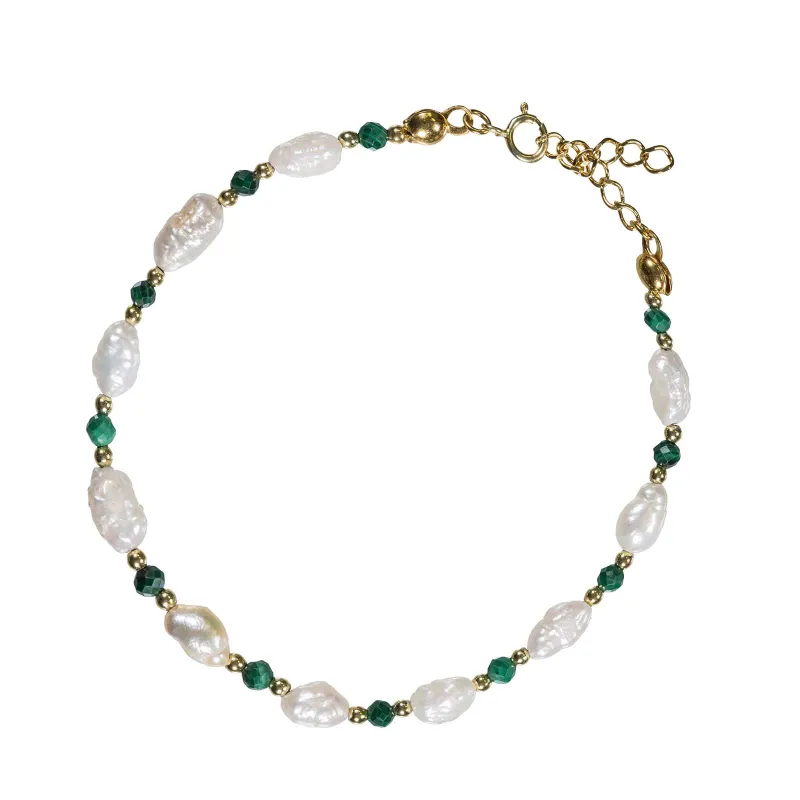 Perła, Malachit - Srebrna Pozłacana Bransoletka na Zdrowie, Uzdrawianie, Intuicję - Skarby Oceanu