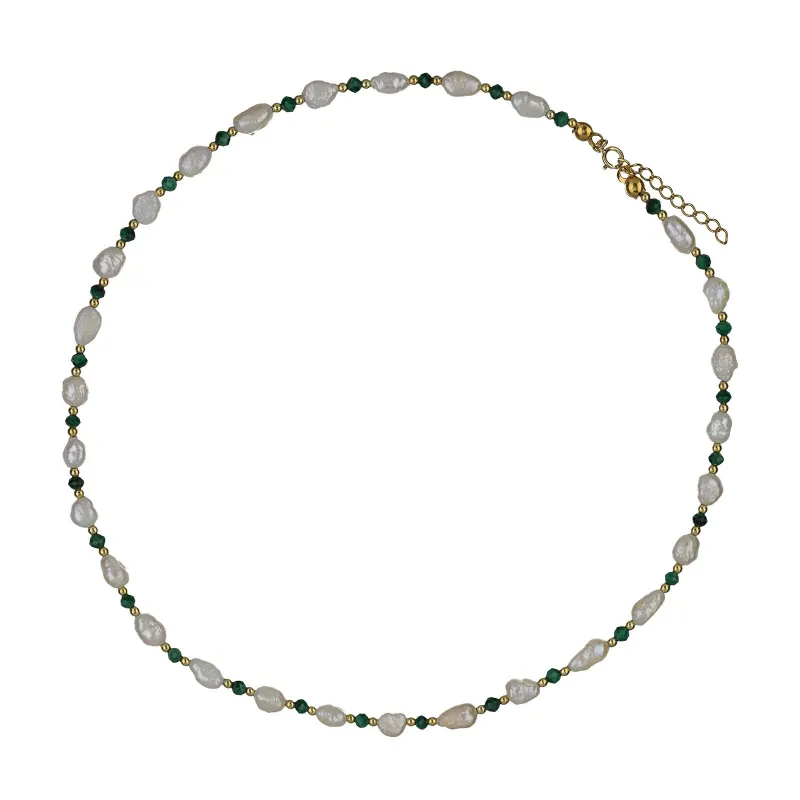 Ten wyjątkowy naszyjnik, wykonany z srebra pozłacanego, jest nie tylko ozdobą, ale także talizmanem. Każde jego ogniwo, od błyszczących pereł po zielone, fasetowane malachity, przepełnione jest energią i symbolicznym znaczeniem.