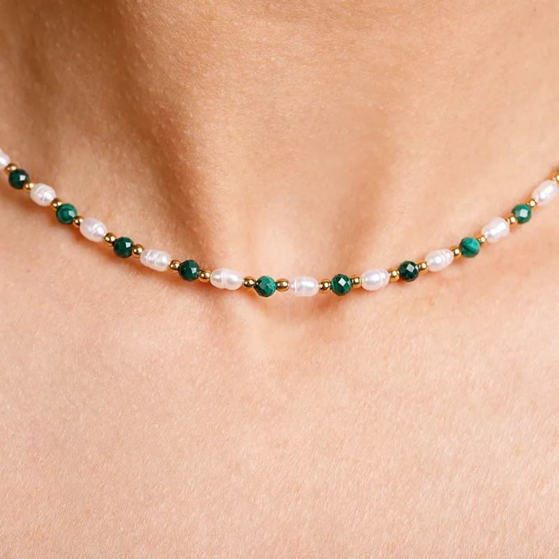 W sercu każdego oceanu skrywa się magia. Mówi się, że perły, narodzone z cierpienia, niosą ze sobą moc uzdrawiania i odrodzenia. W połączeniu z zielonym malachitem, kamieniem intuicji i równowagi, tworzą niezwykłą kompozycję, która wzmacnia siłę ducha i dodaje odwagi w dążeniu do wewnętrznego spokoju.