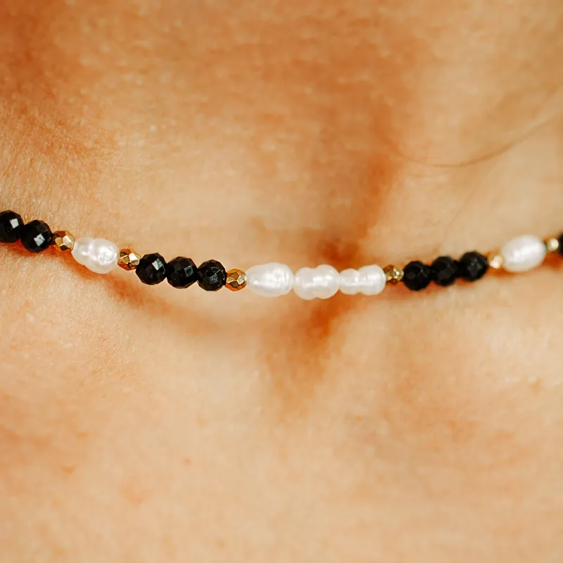 Perły o średnicy 3-4mm o kształcie perły i oponki, emanują łagodnym połyskiem, dodając naszyjnikowi subtelnego uroku. Czarny onyks o gładkiej powierzchni i połysku tworzy kontrastowy akcent, podkreślając elegancję i wyrafinowanie całości.