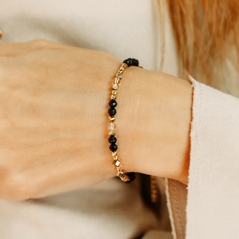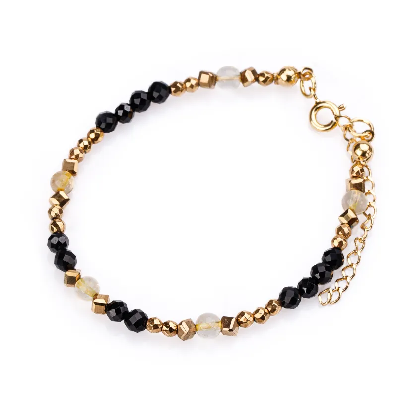 - Kamienie: Delikatne kulki fasetowane, gładkie kulki oraz kostki naturalnego Onyksu, Cytrynu i Hematytu o rozmiarze 3-4 mm, emanujące eleganckim połyskiem.