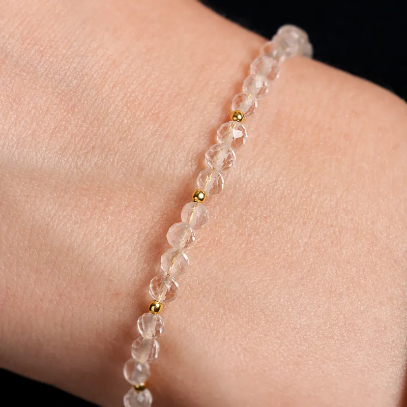 Ta wyjątkowa bransoletka, wykonana z srebra pozłacanego, została stworzona z myślą o kobietach pragnących wzmocnić swoje połączenie z wewnętrzną siłą i harmonią. Delikatne, fasetowane kulki Kryształu Górskiego o średnicy 4mm, wplecione w srebrny łańcuszek, tworzą subtelny, ale jednocześnie elegancki design. Bransoletka dostępna jest w rozmiarach od 16cm do 26cm, dzięki czemu idealnie dopasuje się do Twojego nadgarstka.