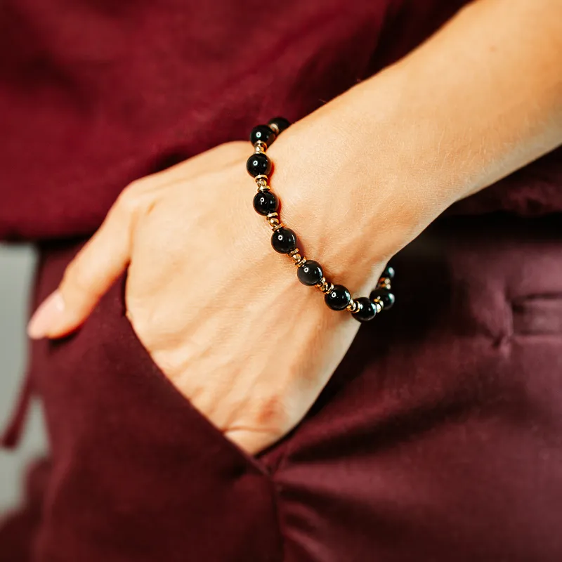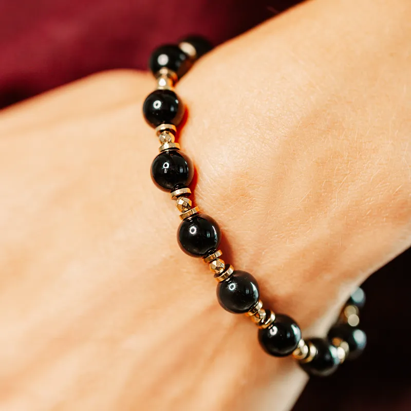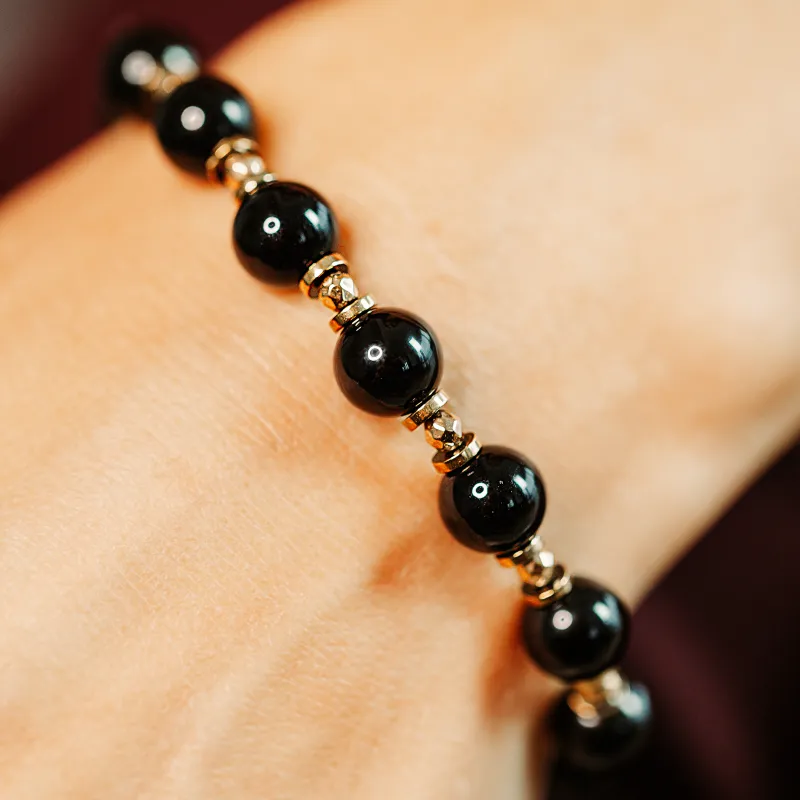 Hematyt z kolei symbolizuje zakorzenienie i materialne bogactwo. To kamień sukcesu, który wzmacnia pewność siebie, wspiera logiczne myślenie oraz przyciąga energię dostatku. W połączeniu z turmalinem tworzy wyjątkową synergię – równowagę między ochroną duchową a manifestacją materialnych pragnień. Złote refleksy hematytu dodają bransoletce nie tylko blasku, ale i energetycznej wibracji słońca – źródła siły, życia i inspiracji.