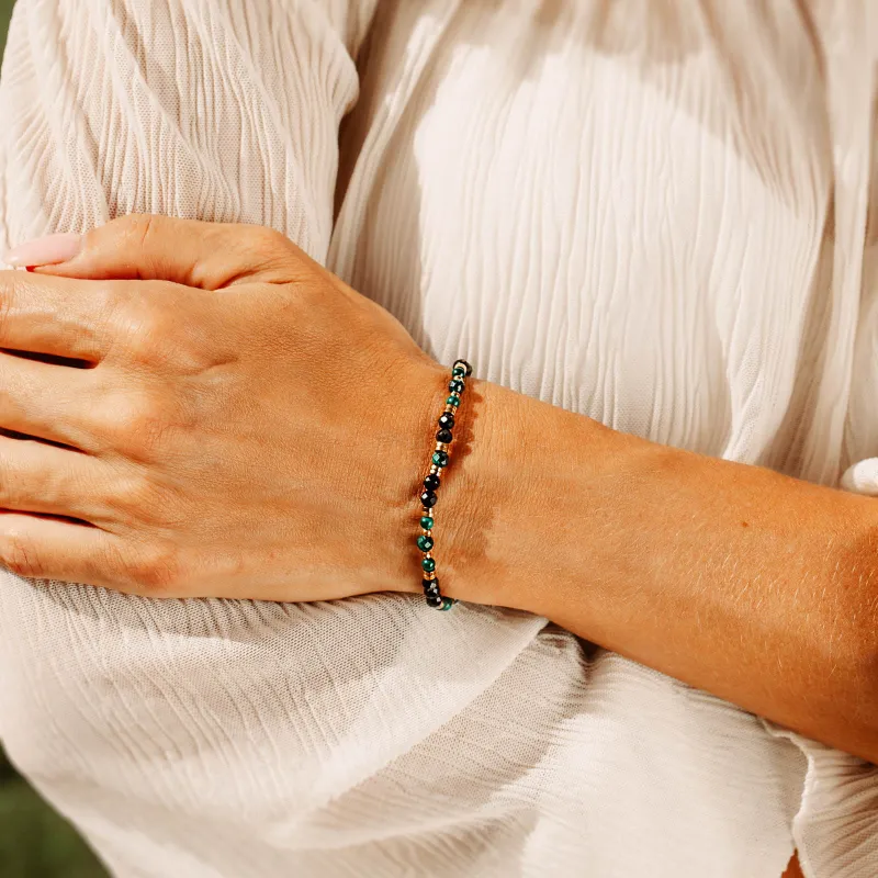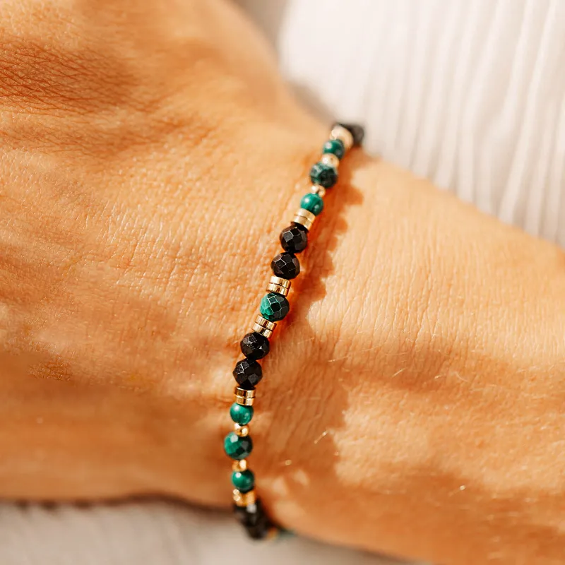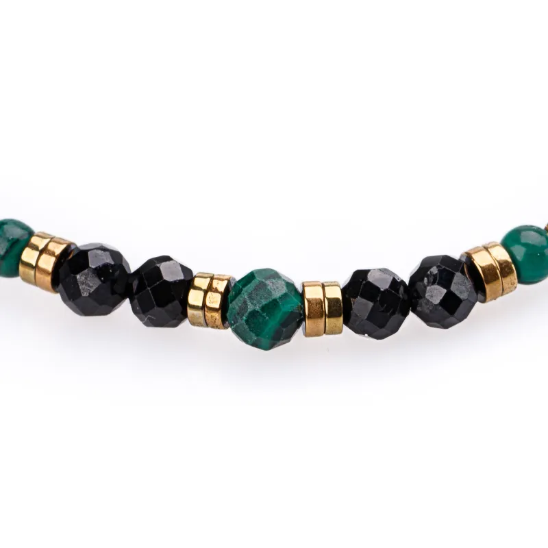 - Malachit: Zielony malachit, kamień obfitości i dobrobytu, wnosi do bransoletki energię wzrostu i rozwoju. Pomaga przyciągać bogactwo nie tylko w sensie materialnym, lecz także duchowym, otwierając serce na nowe możliwości i inspirując do działania. Jego kolor symbolizuje nadzieję i odrodzenie.