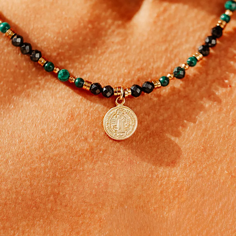 Starannie wyselekcjonowane kamienie zostały złożone w kompozycję przypominającą monetę, symbolem bogactwa i dostatku. Ten zgrabny design nosi w sobie głębokie znaczenie, odzwierciedlając trójwymiarową ochronę, jaką oferuje naszyjnik: