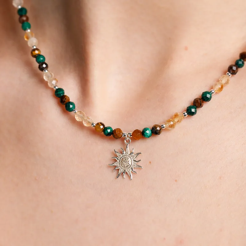 Ten wyjątkowy naszyjnik to prawdziwy talizman stworzony z myślą o Tobie. Każdy element biżuterii został starannie dobrany i wykonany z najwyższej jakości srebra. Kule fasetowane malachitu, cytrynu i tygrysiego oka o średnicy 4-4.5 mm wprowadzają subtelny blask, który dodaje elegancji i podkreśla piękno naturalnych kamieni.