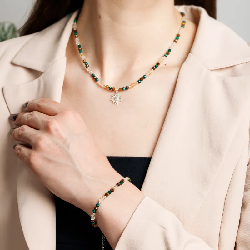 Zielony malachit, symbol obfitości i dobrobytu, od wieków był ceniony za swoje magiczne właściwości. W połączeniu z jasnym cytrynem, który przyciąga szczęście i sukces, oraz z tygrysim okiem, które wzmacnia siłę i odwagę, tworzy harmonijną całość, która wspiera Cię w dążeniu do realizacji swoich celów.