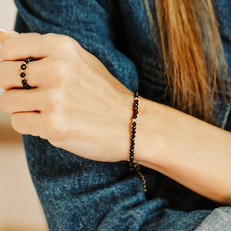 Czarny spinel, o pięknym połysku i kulkowym kształcie, symbolizuje siłę, odporność i równowagę. W starożytności wierzono, że spinel chroni przed negatywnymi wpływami i wspiera zdrowie fizyczne i psychiczne. W połączeniu z błyszczącym srebrem, spinel tworzy elegancki i harmonijny duet, dodając bransoletce niezwykłego wdzięku.