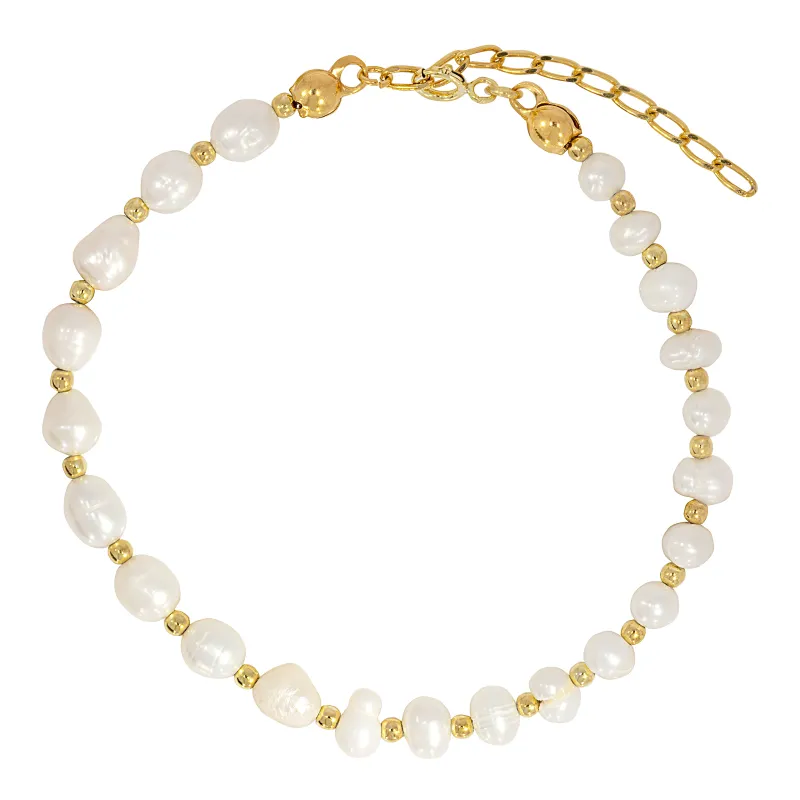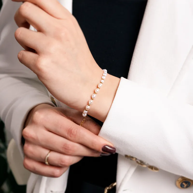 Srebrna, pozłacana bransoletka ozdobiona jest piękną, białą perłą o średnicy 5mm, symbolizującą czystość, elegancję i niewinność. Perła ta od wieków była uważana za symbol mądrości, zdrowia i długowieczności. Jej łagodny blask emanuje spokojem i harmonią, przyciągając pozytywne energie.