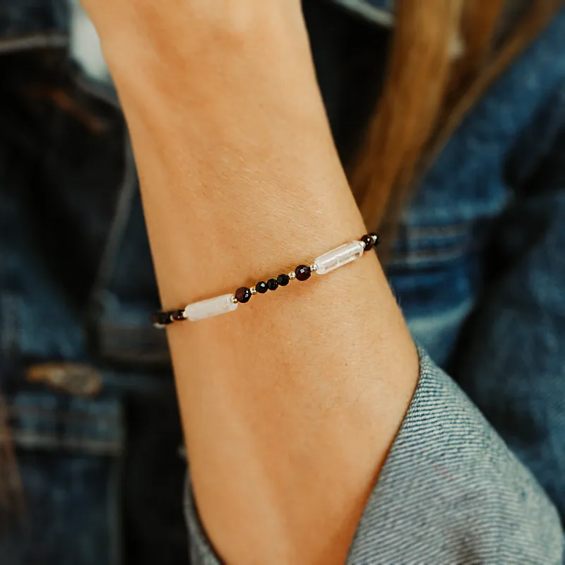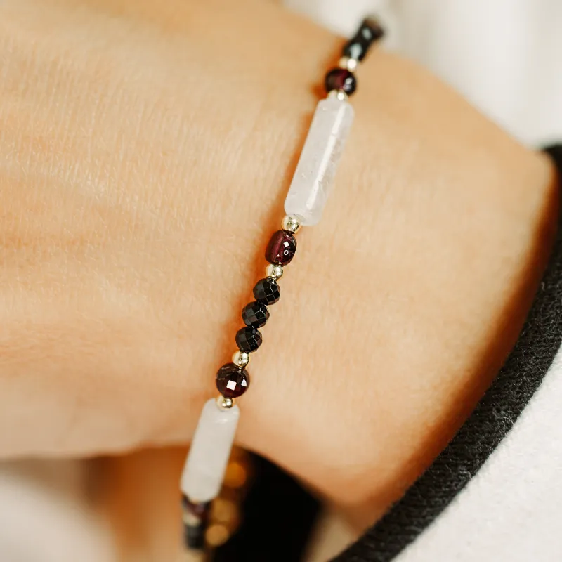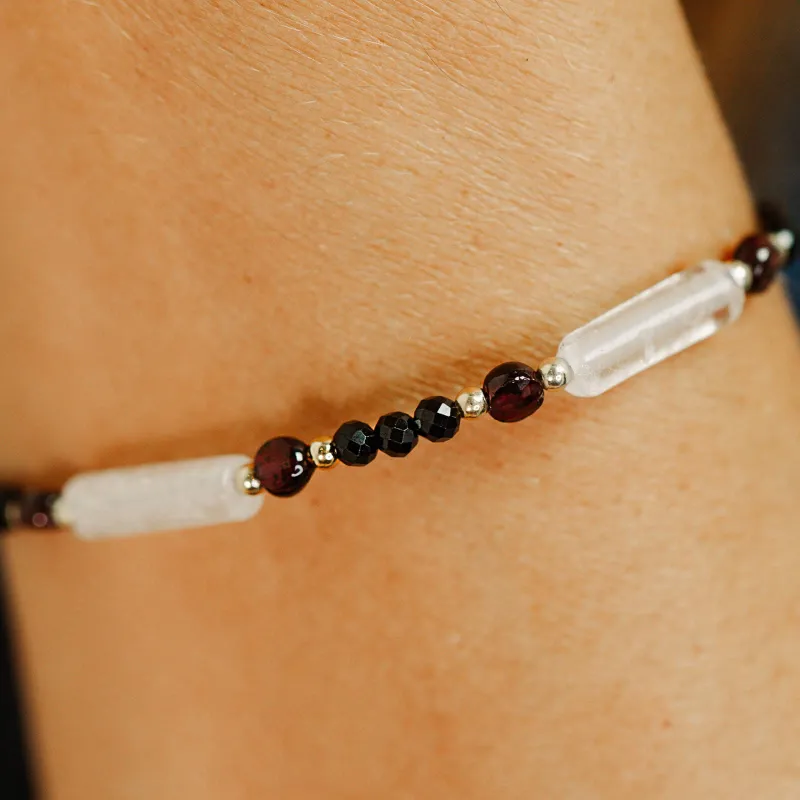 Bransoletka ta łączy w sobie trzy wyjątkowe kamienie: spinel, granat i kryształ górski, każdy z nich o unikalnych właściwościach, które wzajemnie się uzupełniają. Spinel, symbolizujący odwagę i siłę, pomoże Ci pokonać lęki i odnaleźć wewnętrzną moc. Granat, kamień pasji i energii, rozbudzi w Tobie kreatywność i przyciągnie obfitość. Kryształ górski, symbol czystości i harmonii, wzmocni Twoją intuicję, pomoże Ci odnaleźć jasność umysłu i wewnętrzny spokój.