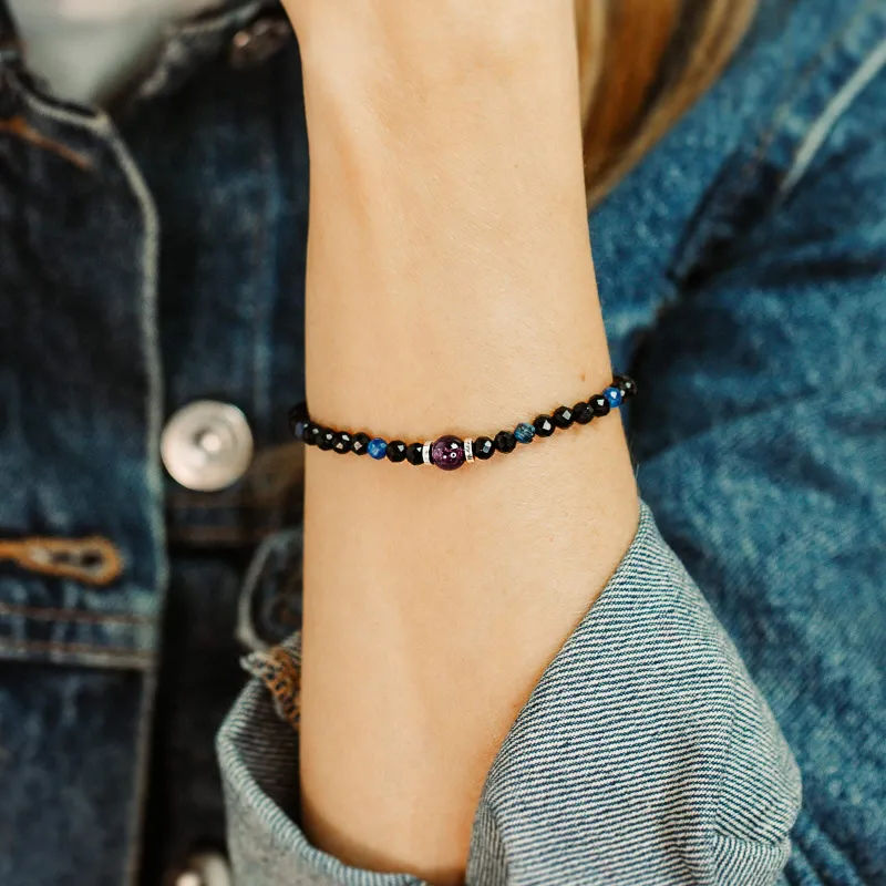 Każdy element tej bransoletki został starannie dobrany, aby stworzyć harmonijną kompozycję, która łączy w sobie siłę onyksu, spokój ametystu i inspirację kyanitu. Srebro, w którym zostały osadzone kamienie, dodaje elegancji i wyrafinowania, podkreślając wyjątkowy charakter tej biżuterii.