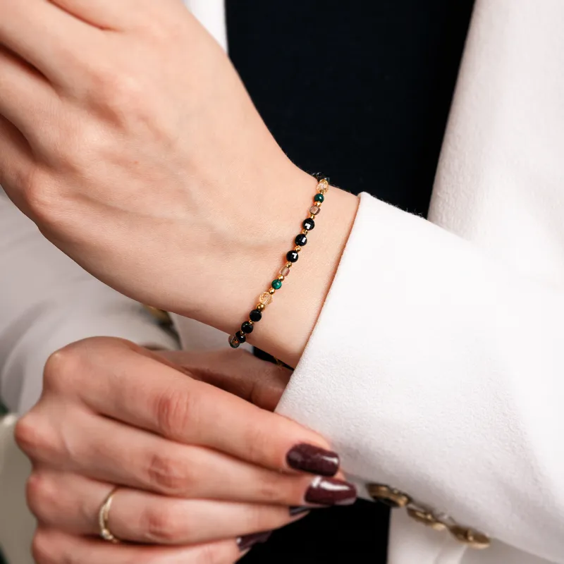 Kwarc Dymny, Malachit, Turmalin - srebrna pozłacana bransoletka na siłę, uzdrowienie, kreatywność - Światło Spokoju