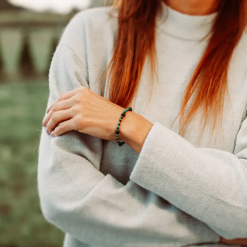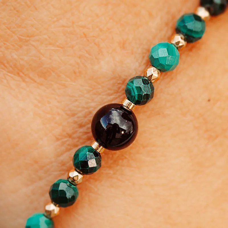Bransoletka z kolekcji Wewnętrzna Ochrona to wyjątkowa biżuteria, która łączy naturalne kamienie turmalinu, malachitu i hematytu, tworząc harmonijną kompozycję na ochronę, bogactwo i uzdrowienie. Kamienie o intensywnych, naturalnych barwach – głęboki czarny turmalin, zielony malachit oraz złoty połysk hematytu – wzmacniają swoją energetyczną moc, oferując ochronę i wsparcie w codziennym życiu.