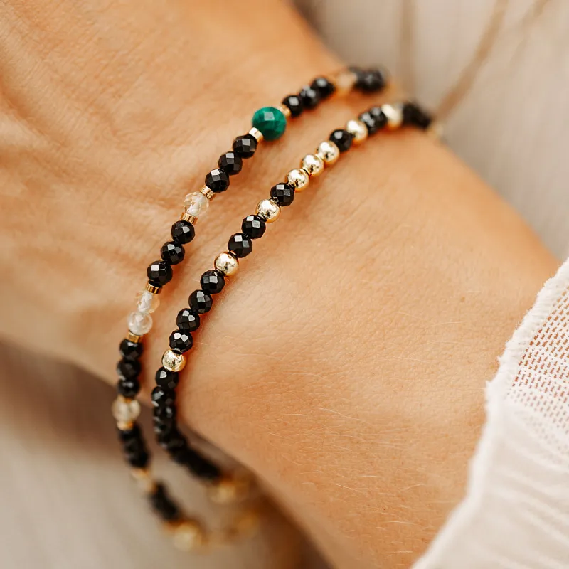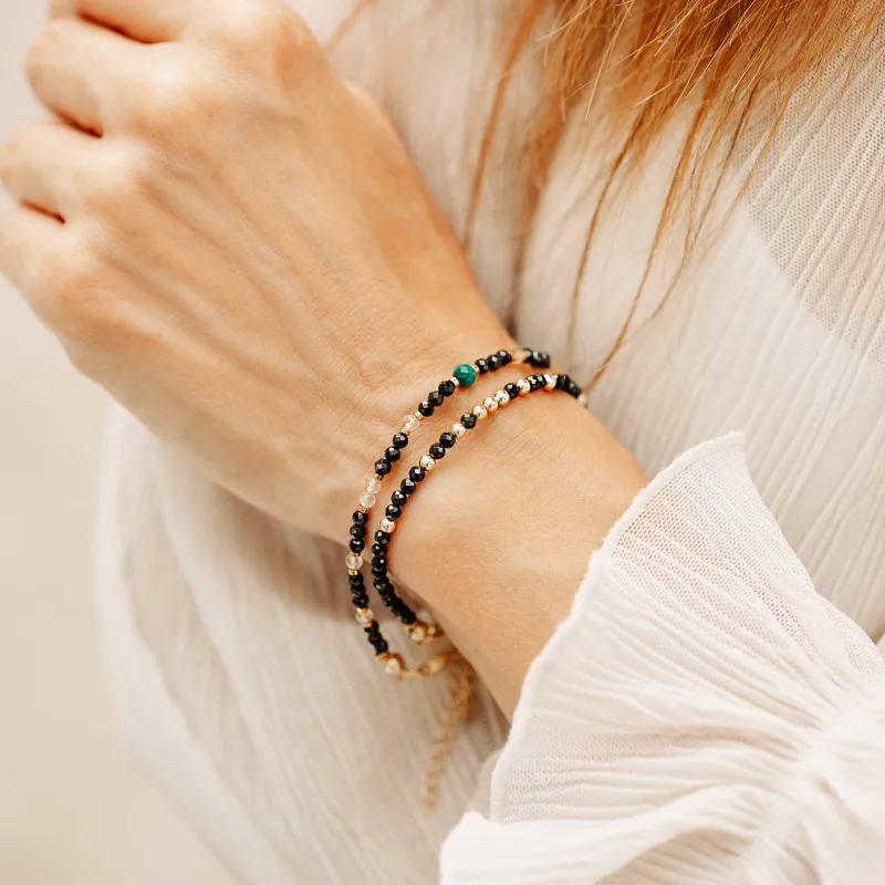 Ciemny, magnetyczny spinel symbolizuje ochronę i siłę, dodając właścicielce odwagę i pewność siebie. Zielony malachit, pełen tajemniczej energii, przyciąga bogactwo i obfitość, wspierając rozwój kariery i sukcesy finansowe. Cytryn, symbol czystości i jasności, wzmacnia koncentrację i pomaga w osiągnięciu jasności umysłu.