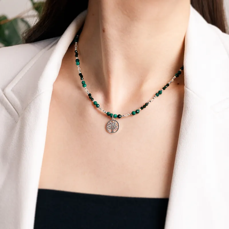 Kryształ Górski, Malachit, Szmaragd, Hematyt - srebrny naszyjnik na intuicję, sukces, uzdrowienie - Światło Spokoju