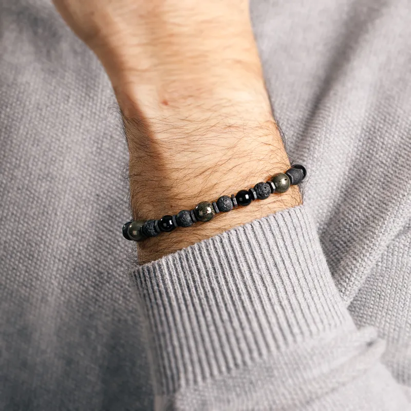 Piryt, Turmalin, Lawa Wulkaniczna, Hematyt - bransoletka męska na bogactwo, siłę, kreatywność - Jego styl