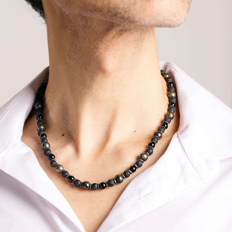 Piryt, Turmalin, Lawa Wulkaniczna, Hematyt - srebrny naszyjnik męski na bogactwo, siłę, kreatywność - Jego styl