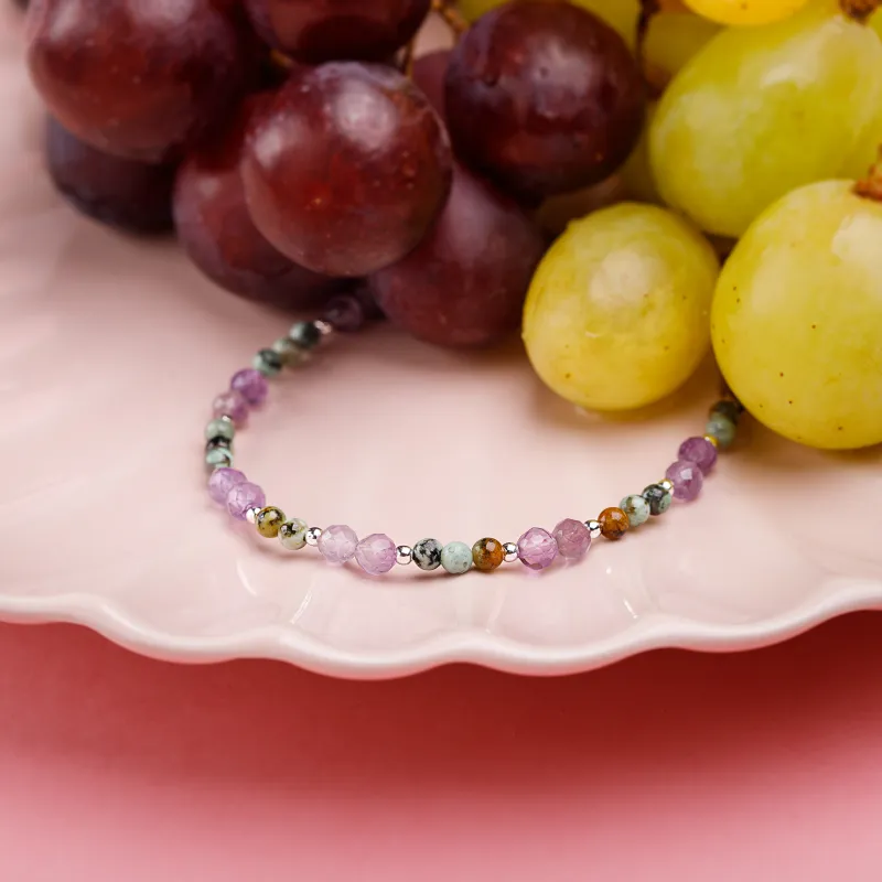 Ametyst, kamień o fioletowym kolorze, symbolizuje spokój ducha, równowagę emocjonalną i intuicję. Wzmacnia koncentrację i pomaga w medytacji. Noś tę bransoletkę, aby wzmocnić swój wewnętrzny spokój i odnaleźć harmonię w życiu.