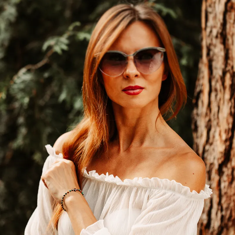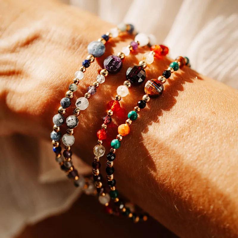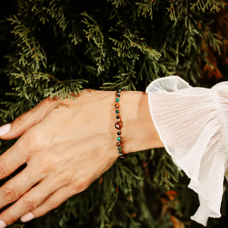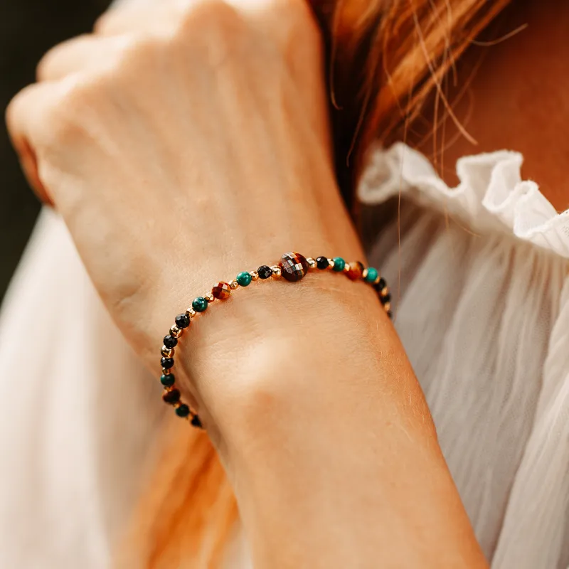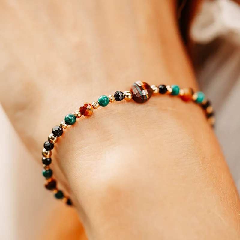 Kompozycja tej bransoletki została zaprojektowana w celu stworzenia optymalnego przepływu energetycznego, skoncentrowanego na czakrach korzenia i splotu słonecznego. Połączenie kamieni o dominujących kolorach: Brązowy, Zielony i Czarny, odzwierciedla paletę sił natury – uziemienie, wzrost i ochronę. Każdy minerał pełni określoną funkcję w polu elektromagnetycznym użytkowniczki.