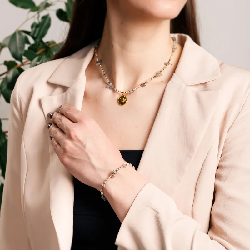 Poczuj, jak szlachetne kamienie, niczym skrawki nieba i ziemi, splatają się w harmonijną całość. Ich dawne echa niosą ze sobą obietnicę klarowności myśli i wewnętrznego spokoju, inspirując do odważnego kroczenia własną ścieżką. Pozwól, by ten delikatny akcent na Twoim nadgarstku stał się Twoim osobistym drogowskazem, prowadzącym przez światło i cień.