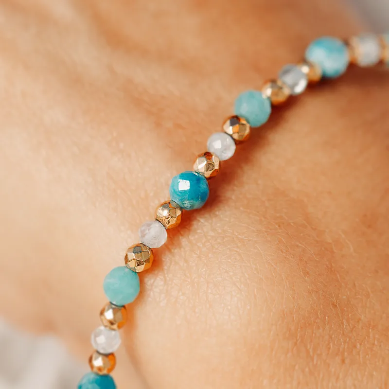 Pozwól sobie na duchowe przebudzenie z tą piękną, ręcznie wykonaną bransoletką, która łączy w sobie symboliczne znaczenie trzech kamieni szlachetnych: apatytu, akwamarynu i amazonitu.