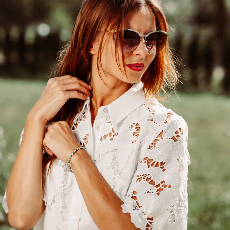 Srebrna bransoletka, subtelnie pozłacana, podkreśla elegancję i piękno kamieni. Jej delikatne zapięcie na sznurek sprawia, że bransoletka jest wygodna i łatwa w noszeniu.