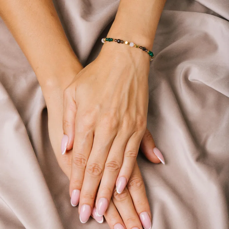 Odkryj moc natury zamkniętą w subtelnej formie bransoletki. To nie tylko piękny dodatek, ale talizman wzmacniający siłę, wspierający uzdrawianie i rozwijający kreatywność. Bransoletka łączy w sobie elegancję srebra pozłacanego z energią naturalnych kamieni - kwarcu dymnego, malachitu i jadeitu.
