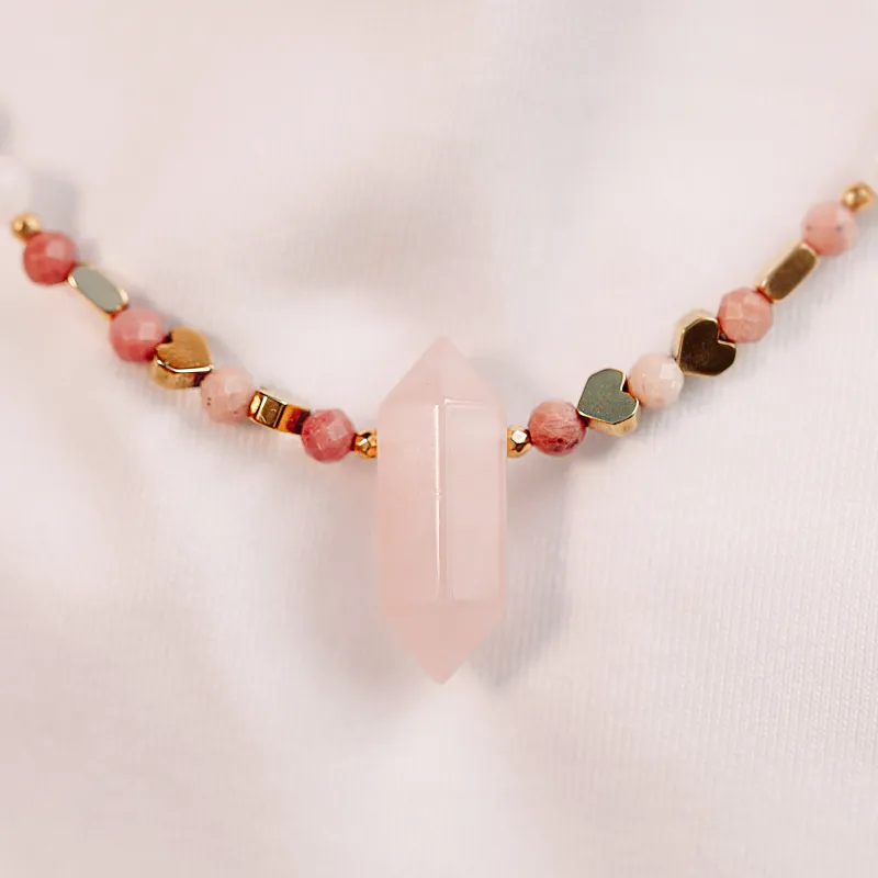 Kwarc Różowy, Rodochrozyt, Kamień Księżycowy - srebrny pozłacany naszyjnik na miłość, harmonię - Ezoteryczna Elegancja