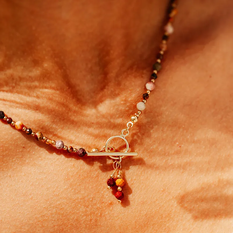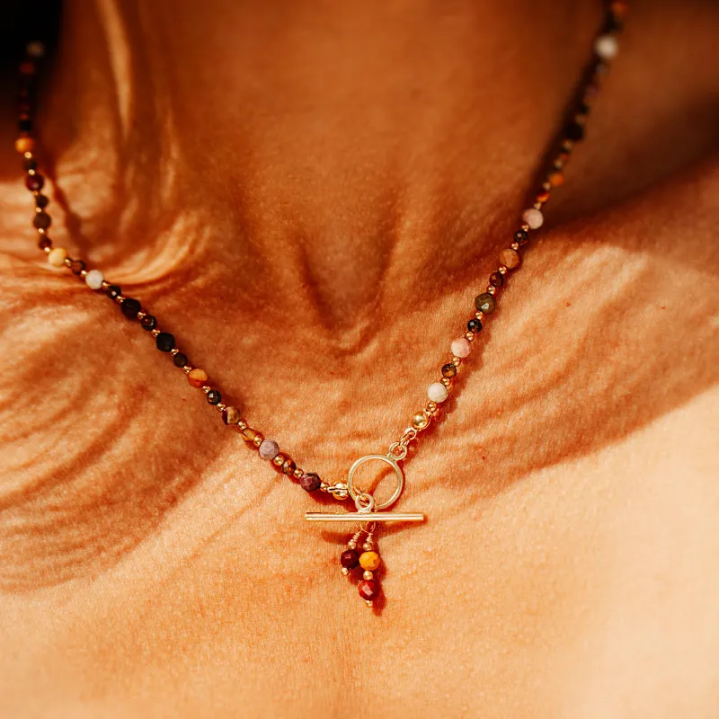 Każdy element tego naszyjnika został starannie dobrany, aby stworzyć harmonijną kompozycję, wzmacniającą oddziaływanie poszczególnych kamieni. Złoty blask srebra pozłacanego doskonale podkreśla głębię barw i wyjątkowy charakter zawieszki.