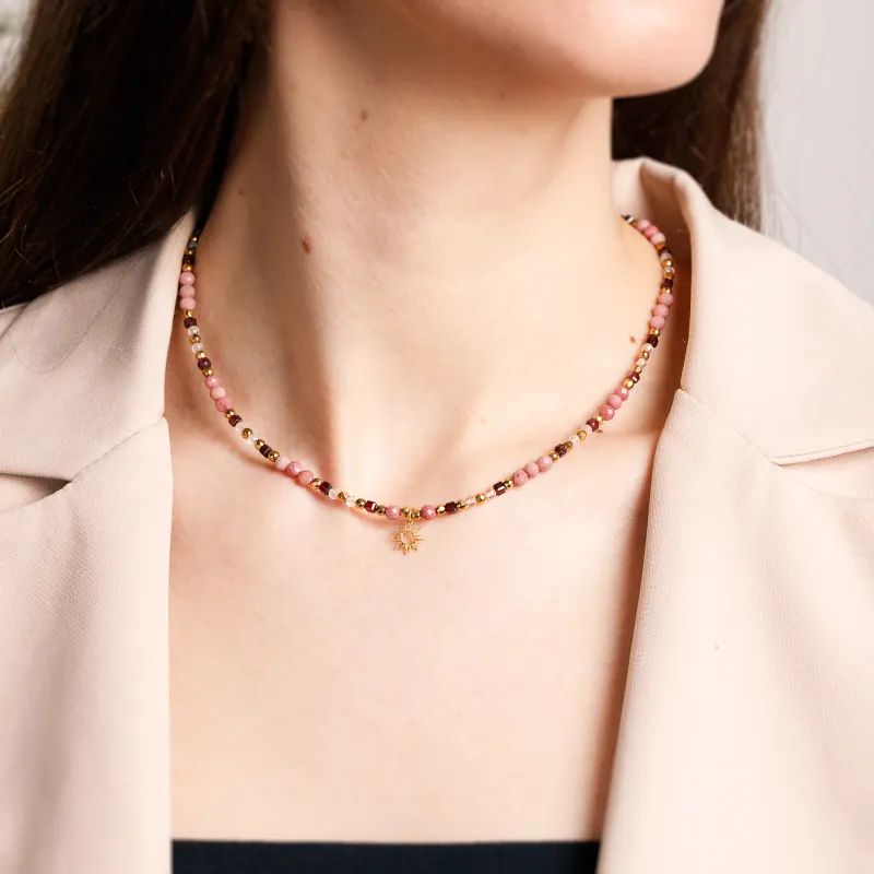 Stworzony z dbałością o każdy detal, naszyjnik Kryształ Górski, Granat, Rodochrozyt, Hematyt to połączenie szlachetnych materiałów i precyzji rzemiosła, które zachwyca swoją subtelnością i jakością:
