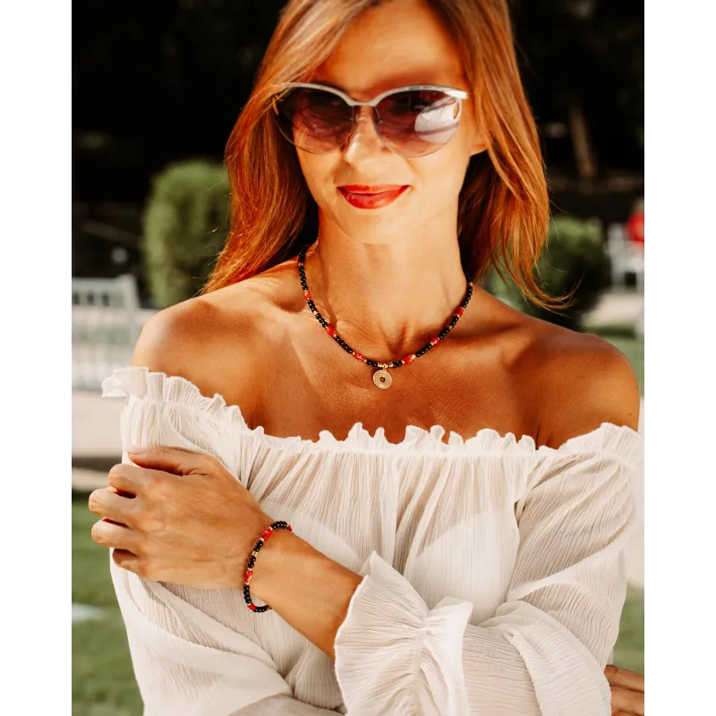 Naszyjnik "Turmalin, Jaspis, Hematyt - srebrny pozłacany naszyjnik na ochronę, bogactwo, uzdrowienie - Wewętrzna Ochrona" został stworzony z dbałością o każdy detal. Srebro pozłacane gwarantuje trwałość i blask, a walcowe kamienie o rozmiarach 2-4 mm subtelnie podkreślają jego elegancję. Kolisty kształt zawieszki symbolizuje cykl życia i nieskończoną moc natury. Długość naszyjnika regulowana jest w zakresie 40-45 cm, dopasowując się do indywidualnych potrzeb.