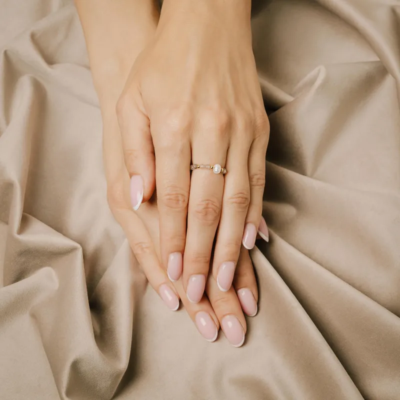 - Szary kolor kamienia, kojarzący się z spokojem i równowagą, dodaje pierścionkowi tajemniczego uroku.