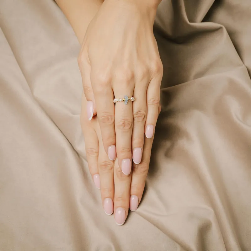 W sercu pierścionka tkwi biała perła, symbol czystości, niewinności i piękna. Jej łagodna świecąca aura ożywia i wzmacnia kobiece charaktery, inspirując do szukania harmonii i pokoju. Dodatkowo, perła to talizman wzmacniający intuicję, wzmacniający więzi międzyludzkie i sprzyjający przepływowi energii.