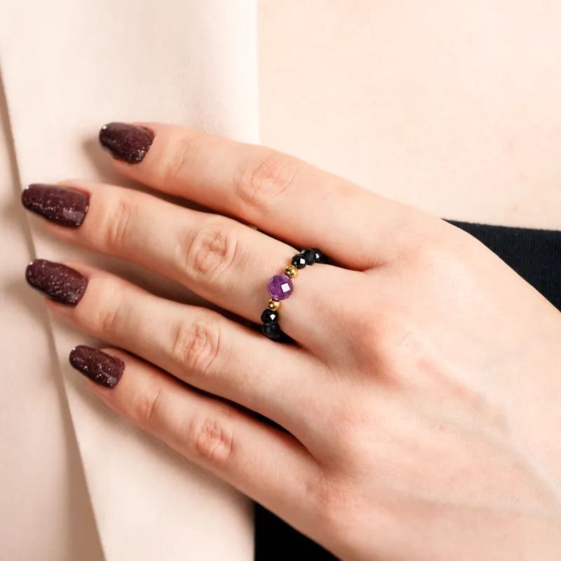 Spinel, Ametyst, Hematyt - srebrny pozłacany pierścionek na koncentrację, miłość, sukces - Wewnętrzna Ochrona