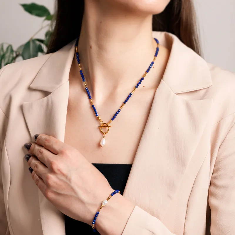 - Kamienie: Naturalne perły, Lapis Lazuli i Hematyt o zróżnicowanej wielkości (2-6 mm) pięknie współgrają ze sobą.