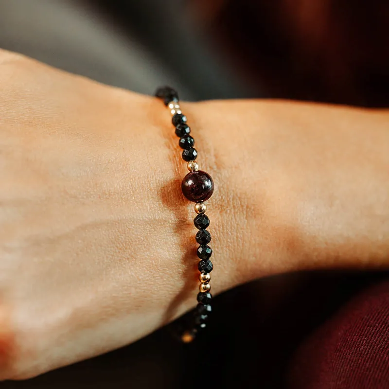Hematyt uzupełnia ten zestaw energią zdrowia i stabilności. Jego metaliczny połysk odbija negatywne wibracje, a jednocześnie wzmacnia siłę fizyczną i psychiczną. Symbolizuje zakorzenienie i równowagę, przynosząc poczucie bezpieczeństwa. W połączeniu z granatem i turmalinem tworzy duchową triadę – miłość, ochronę i zdrowie.