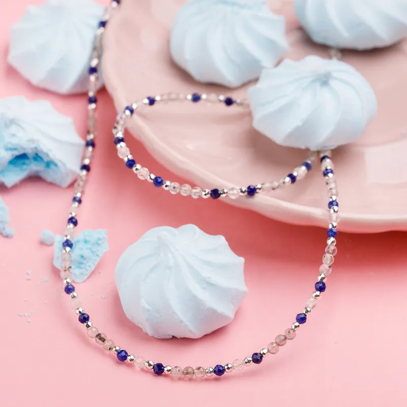 - Kamienie: Fasetowane kulki Labradorytu, Kryształu górskiego i Sodalitu, delikatnie odbijające światło.