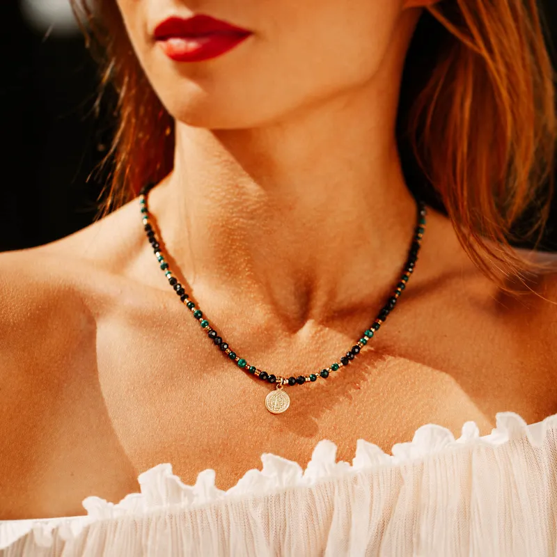 Każdy kamień w tym zestawie został starannie wybrany ze względu na swoje unikalne właściwości i symboliczne znaczenie. Połączenie czarnego hematytu, zielonego malachitu i złotego turmalinu tworzy potężny amulet, wzmacniający Twoją wewnętrzną siłę i ochronę.