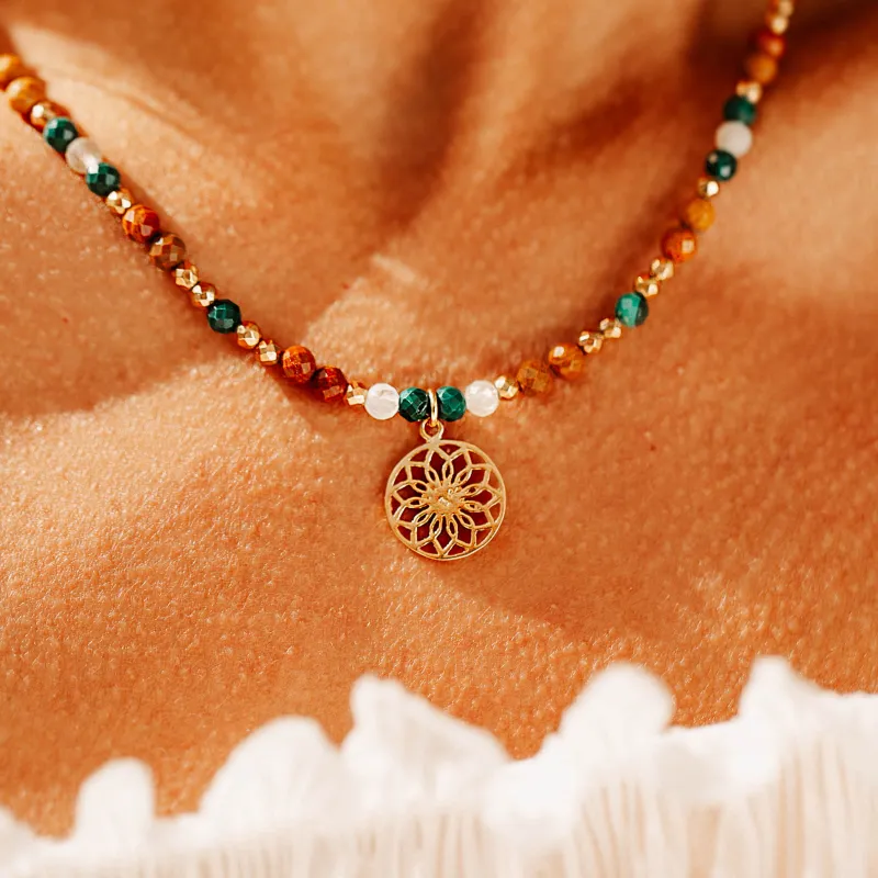Centralnym elementem zarówno naszyjnika, jak i bransoletki jest subtelna, lecz pełna wyrazu rozeta. W symbolice wielu kultur rozeta reprezentuje perfekcje, harmonię i rozkwit potencjału. W tym zestawie, symbolizuje ona rozkwit Twojego wewnętrznego bogactwa – bogactwa ducha, emocji i sukcesów.