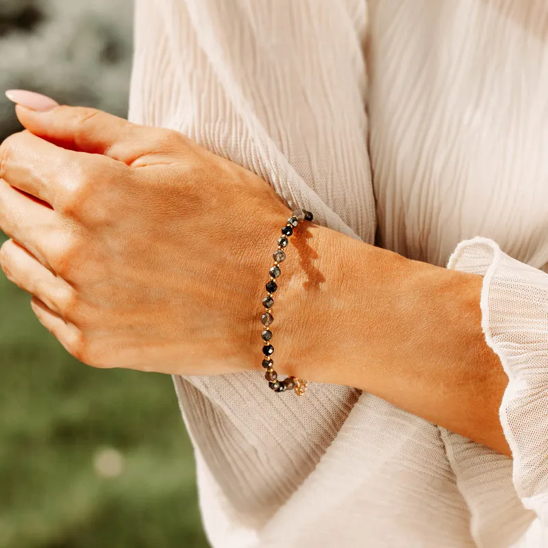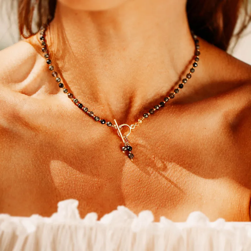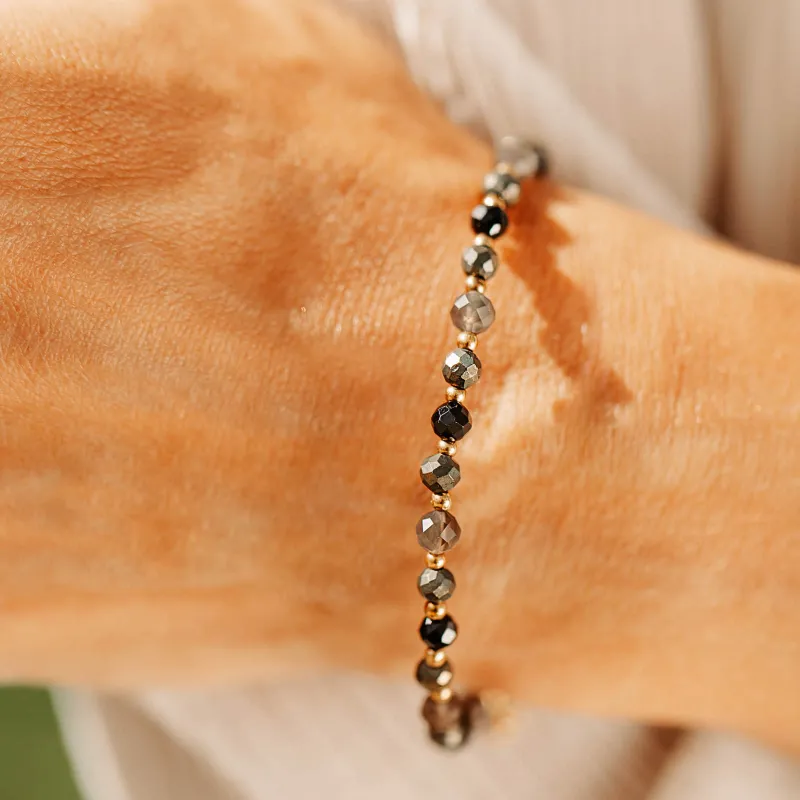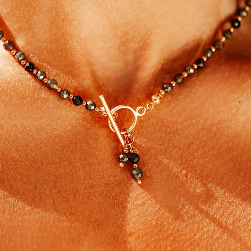 Starannie wyselekcjonowane kamienie szlachetne, będące sercem tego kompletu, niosą ze sobą potężną symbolikę. Czarny spinel, emanujący tajemniczością i siłą, harmonizuje z złotym pirytem, symbolem bogactwa i obfitości. Brązowy kwarc dymny dodaje nutki ziemskiej energii, ugruntowując i wzmacniając połączenie z naturą. Każda kulka, o rozmiarach od 2 do 4 mm, została precyzyjnie oszlifowana, aby uwydatnić naturalne piękno kamieni i ich wewnętrzny blask.