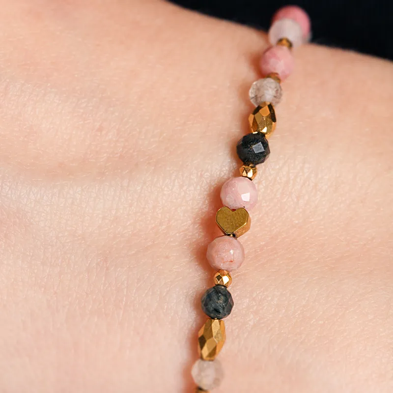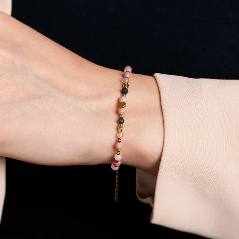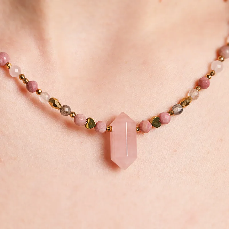 - Kamienie naturalne: kwarc różowy, rodochrozyt i kamień księżycowy, w odcieniach bieli i różu.