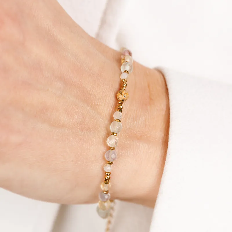 - Bransoletka o delikatnym, drucianym splocie z pozłacanego srebra, ozdobiona kamieniami w rozmiarach od 2 do 6 mm, prezentuje harmonię i subtelną elegancję.