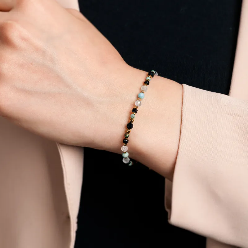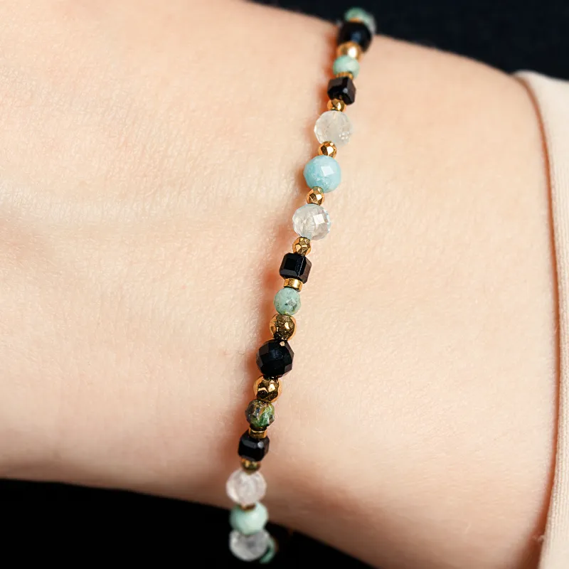 - Kamienie: Starannie wyselekcjonowane kamienie naturalne – Spektrolit (czarny), Turmalin (zielony), Akwamaryn (biały/jasnoniebieski), w rozmiarach od 2 do 7 mm.