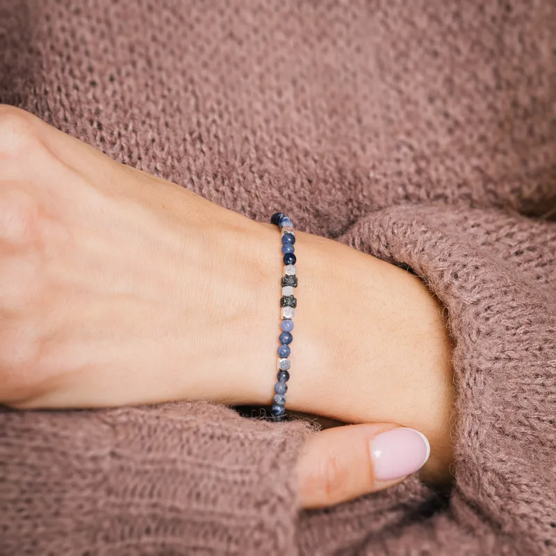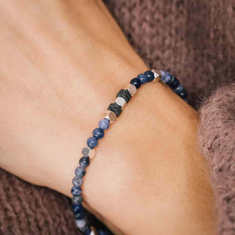 Komplet bransoletek z kolekcji Ona i On wykonany jest z naturalnych kamieni, tworząc harmonijną kompozycję idealnie podkreślającą wyjątkową więź między dwojgiem ludzi. Połączenie głębokiego niebieskiego sodalitu, surowej czerni lawy wulkanicznej i subtelnego połysku srebrnego hematytu nadaje biżuterii elegancki, a jednocześnie ponadczasowy charakter.